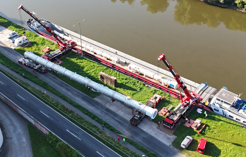 Am 14.08.2024 wurden drei wichtige Kolonnen, die zum Herzstück der Kohlendioxidabscheide- und -verflüssigungsanlage des Joint Venture von Heidelberg Materials und Linde zählen, per Schiff nach Lengfurt geliefert. Ende Mai wurde die Equipments aus China auf den Weg gebracht. Im Seehafen Antwerpen wurden die drei Stahlröhren dann am 5. August auf das 110 m lange und 10,50 m breite Binnenschiff MS „Diomedea“ umgeschlagen.